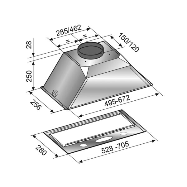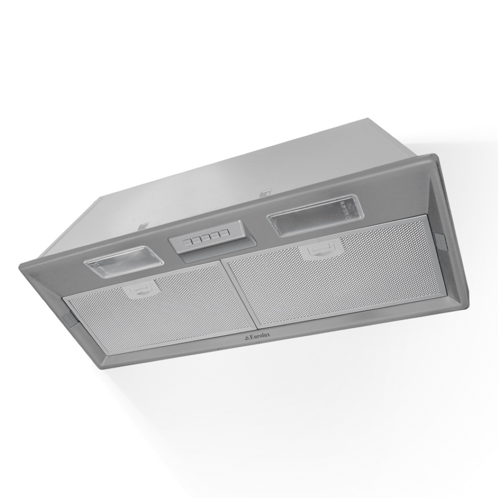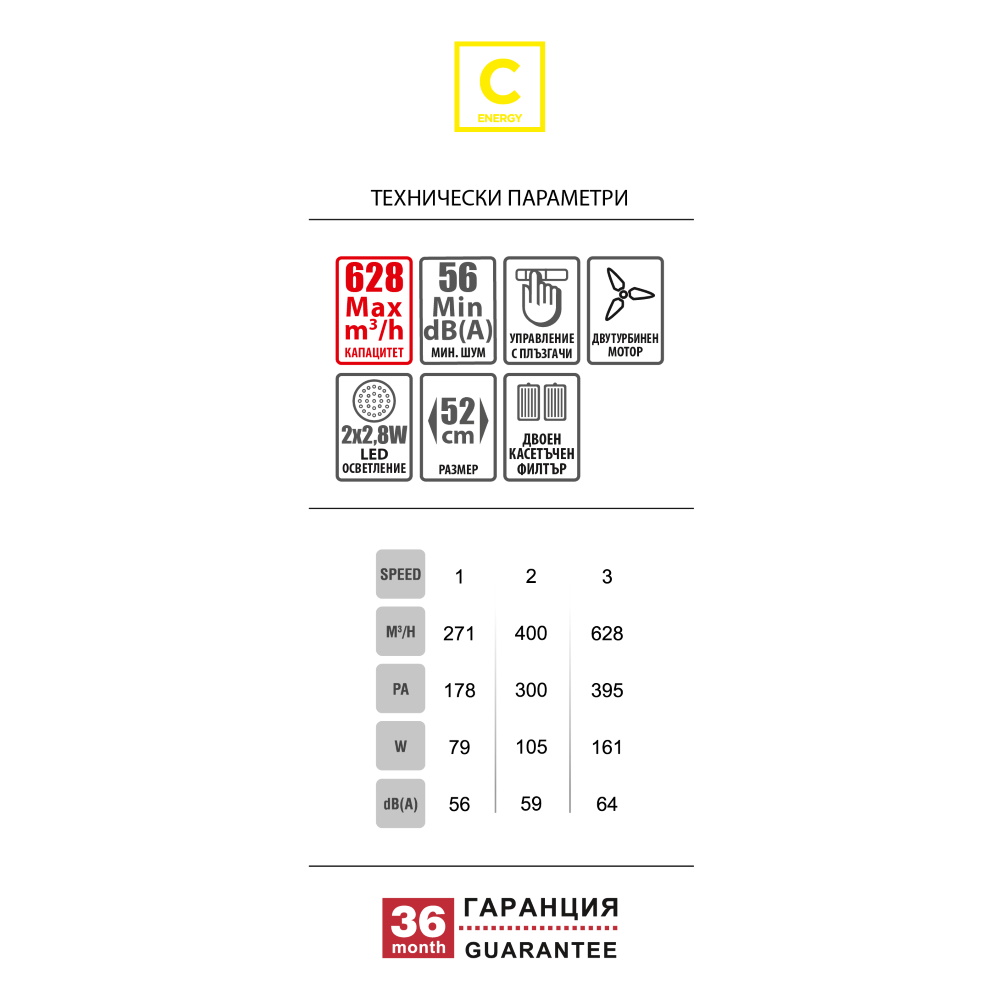 Аспиратор за пълно вграждане с размер 52 см. Капацитет на засмукване 628 м³/ч. Управление с пуш бутони. Енергийно ефективен двутурбинен мотор. LED осветление. Метални касетъчни филтри. Цвят – сив.