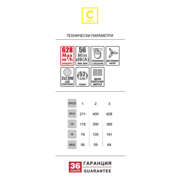 - Капацитет по Европейския стандарт EN 61591 – 628 m3/h